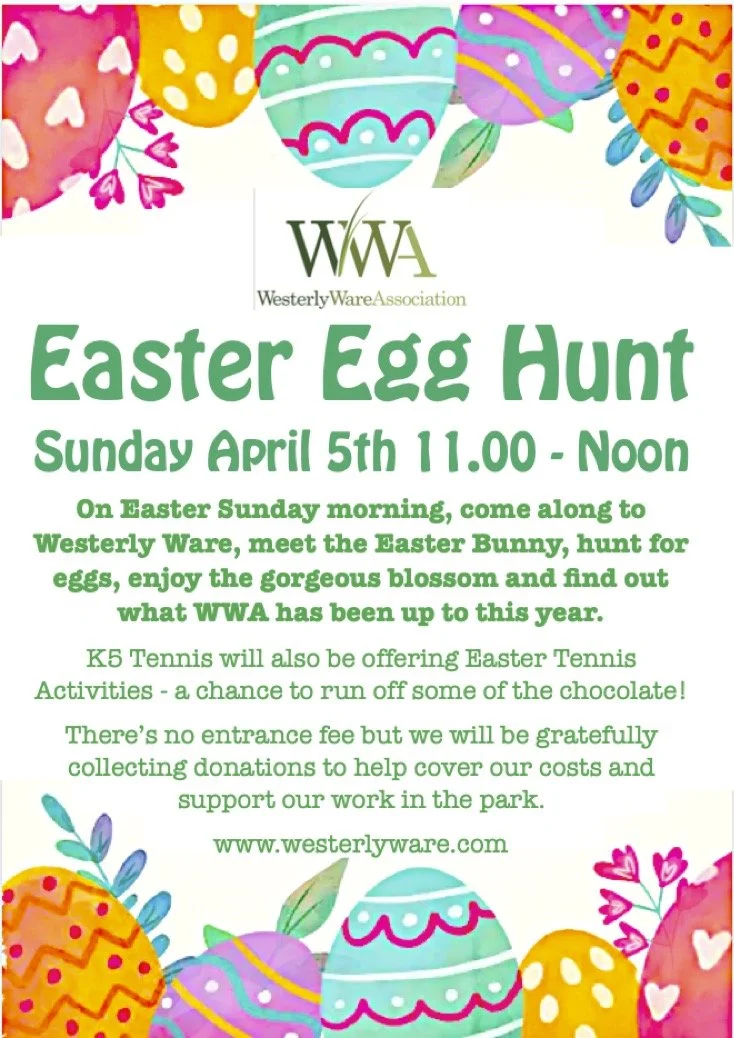 Come to the Westerly Ware Easter Egg hunt on Easter Sunday from 11.00am till noon. Hunt for paper eggs, win some chocolate ones and meet the Easter Bunny.